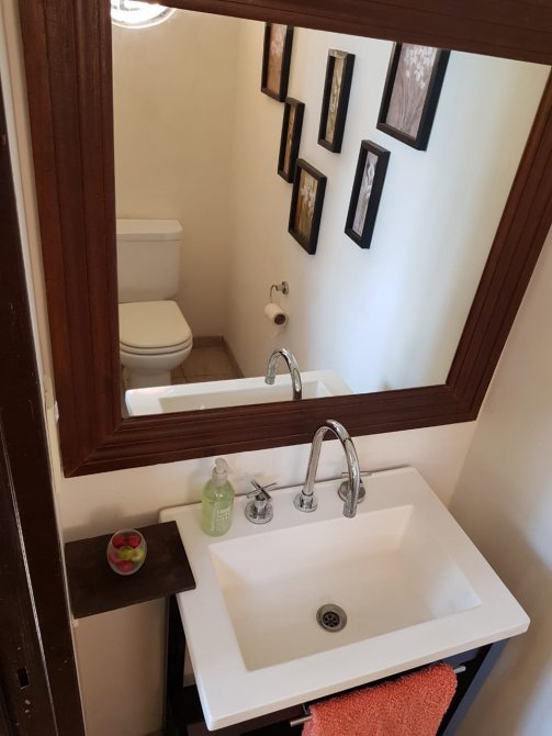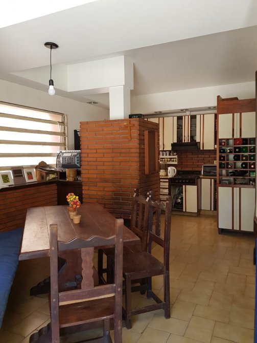 Amplia cocina comedor con alto y bajo mesada, vinoteca y horno empotrado con salida al fondo y baño auxiliar continuado a este pequeño lavadero.