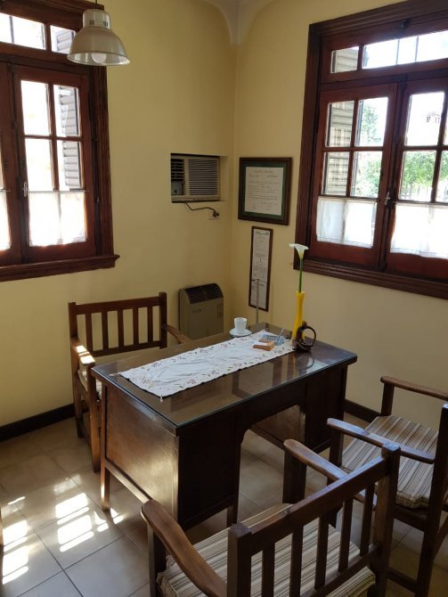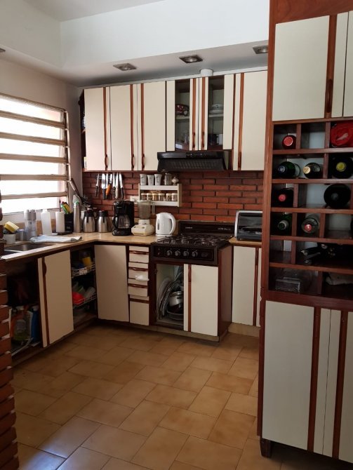 Amplia cocina comedor con alto y bajo mesada, vinoteca y horno empotrado con salida al fondo y baño auxiliar continuado a este pequeño lavadero.